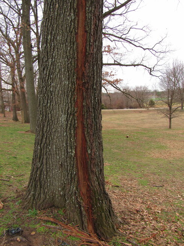 Lightning Strike - Taken on January 13, 2020 as I was sitting on the swing outside of the park Visitors Center when I noticed that this tree had a strip of its bark missing all the way up the tree, with strips of the bark on the ground by Karen Schoenaar