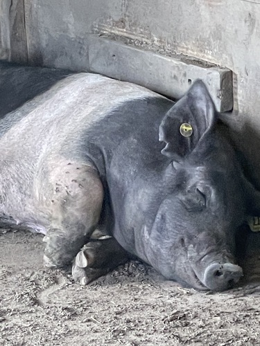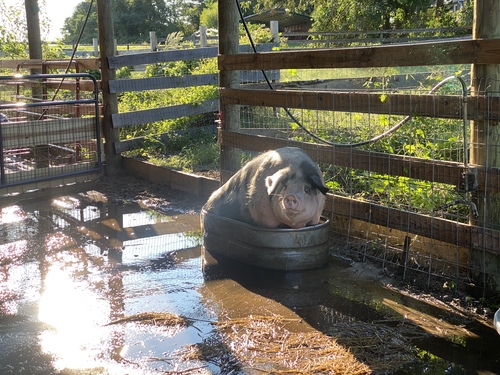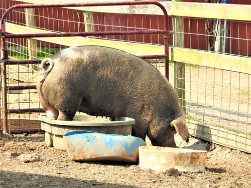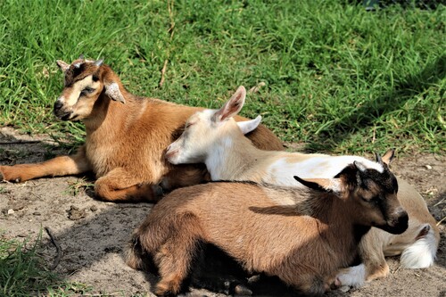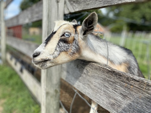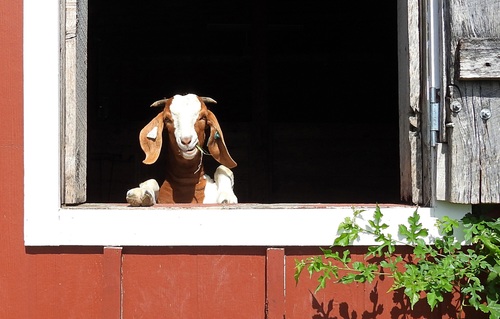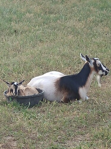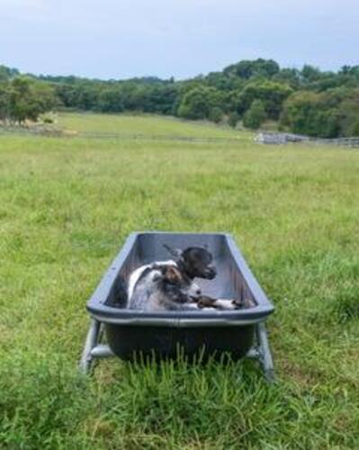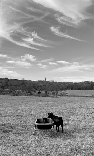 Rub-a-dub-dub One Goat in a Tub - Taken on our family walk at the park on Thanksgiving Day, November 25, 2021. My daughter was home from college and my husband, son, dog nd I along with my daughter were reliving times we have spent together in the park when they were younger. We had stopped to look at the goats and had been paying attention to the ones that were eager to smell our hands and greet us at the fence, but when I looked up to appreciate the beautiful sky in the backdrop, I noticed the goat in the tub. by Kathy Hayes