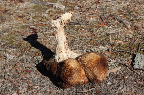 Rolling Mushroom - I spotted this mushroom on February 14,2025, down in the valley on my left as we walked on the path from the Duck Pond to where the informative signs are….The shadow looks like a lama. You can even see an ear, nose, open mouth, and a stumpy tail. This makes you look at the whole thing as a llama sitting there on its's haunches with multicolored fur. But no, it is an upside-down mushroom, finally being able to move, not on its own, but via the heavy winds... by Mirjam Spaar
