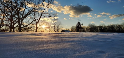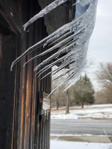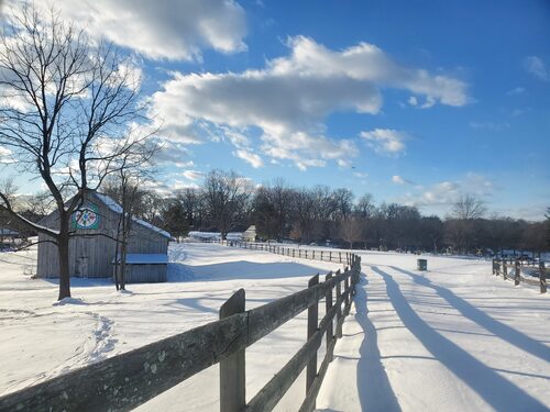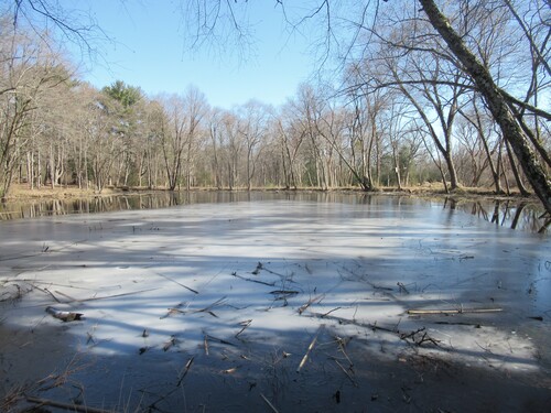 Winter at Bunks Pond - It was so eerily quiet on Feb. 14, 2025, at Bunks Pond. We listened and watched carefully, but did not hear a sound or even see a squirrel in the whole area around the pond. Yet it held its own beauty with the blue skies, the thin coat of ice left over from the last freeze, the reflections, and the crisscrossing of shadows. by Mirjam Spaar