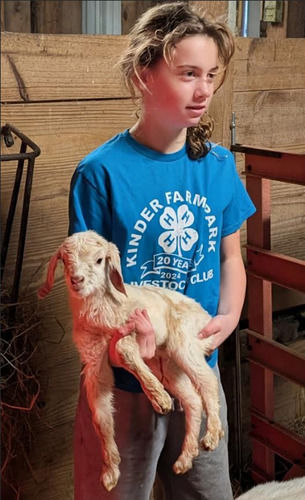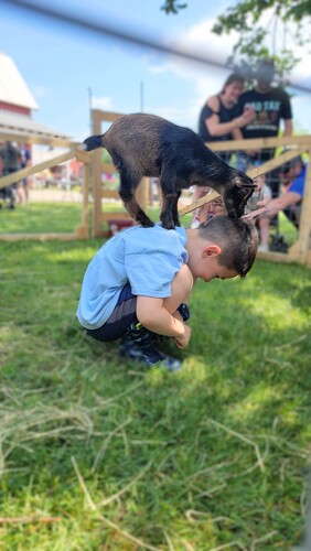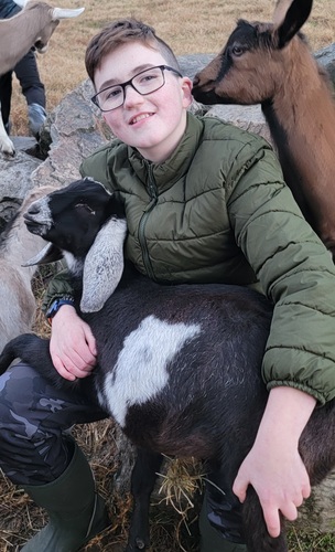 Kid to Kid Connection - Gavin snuggling with his goat Oreo (nubian doeling) and getting investigated by Angel (oberhasli doeling) after completing farm chores with his furry friends in the Large Dairy Squad as an active FLEP volunteer and 4H member in the Nursery Field on December 2, 2025. by Margaux Carlin